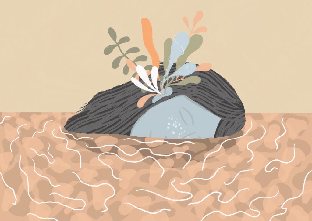 Momentan, parcurg o perioadă în care încerc să mă bucur mai mult de ceea ce am, învăț să nu mai fiu mereu pe fugă și să fiu mai prezentă. Iarna, frigul mai exact, îmi permite mereu să iau o pauză, să mă retrag uneori în al meu “cocon” și să lucrez la proiecte personale. Unde locuiesc eu, avem în jur de treizeci de plante în apartament, deci am inspirație din orice colțișor al casei. Aștept cu nerăbdare primăvara și visez la următoarele plante pe care mi le voi lua, de îndată ce vremea e și mai prielnică. Ilustrația e un îndemn la a lua o pauză, la a te “scufunda” în momentul prezent. (Georgiana Strugariu)