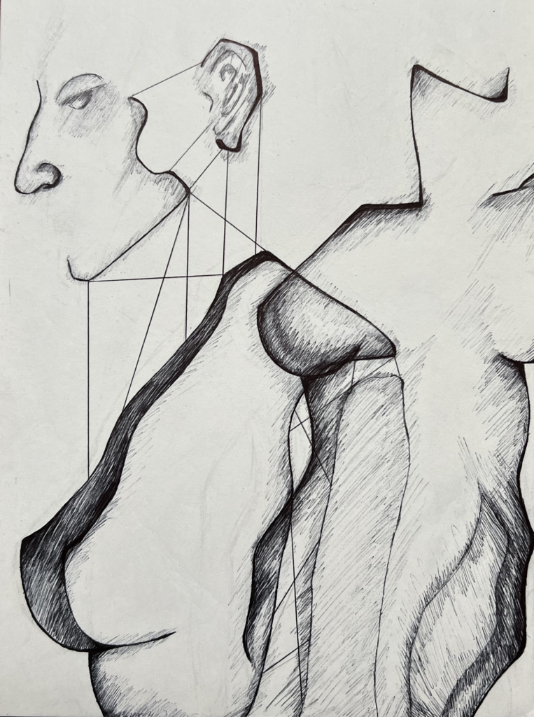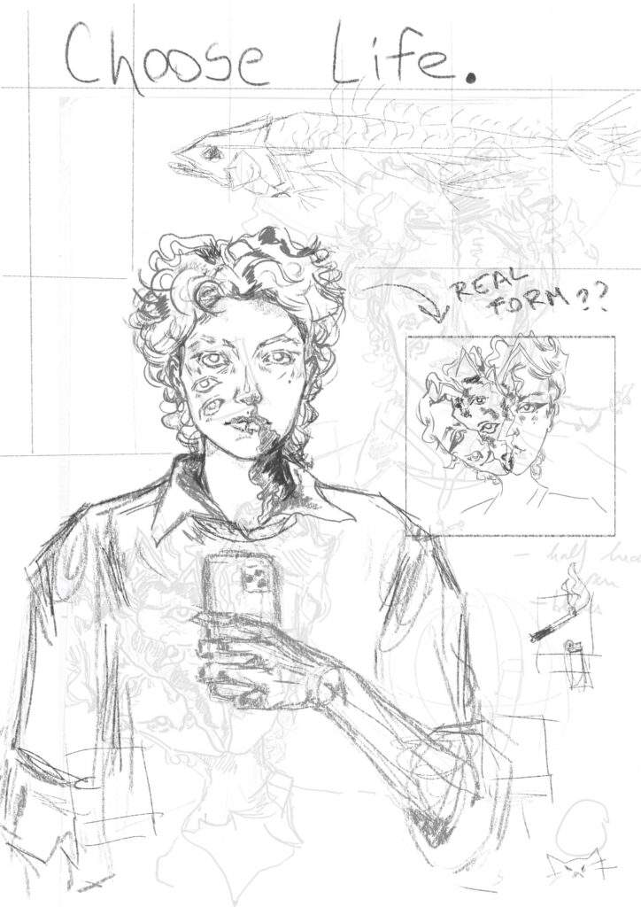 Desen dedicat acelor zile in care ma holbez in oglinda si ma gandesc “ce naiba e gresit cu mine?”. Nimic nu mai are sens, ce se vede este o expresie neutra, ce se simte este inca un sfarsit de lume printre multe altele, poate o schimbare, poate o moarte a ego-ului care sa te duca mai departe. (Andreea Ștefan)
